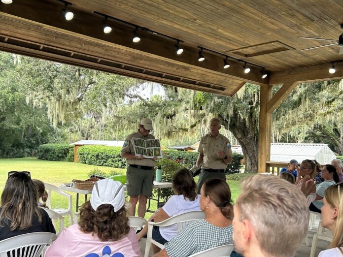 Ranger Woodbury led the discussion offering a primer on the lifecycle of butterflies before delving deeper into a discussion on the five or six main kinds of butterflies known to frequent the property. Showing examples, local butterflies ranged from the colorful Long-tailed Skipper and Gulf Fritillary to the Monarch, Cloudless Sulphur, and the Zebra Heliconian.