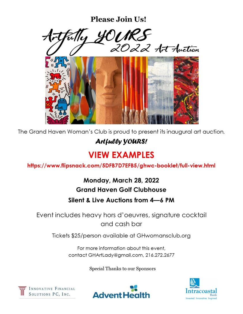 The event will be held at the Grand Haven Golf Club, 500 Riverfront Drive, Palm Coast on Monday, March 28th. The silent auction will begin at 4 pm and transition into the live auction at 5 pm. Advance tickets www.ghwomansclub.org/art-auction.