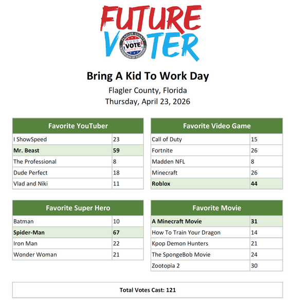 During Bring Your Kid To Work Day 2026, the Flagler County Supervisor of Elections office hosted a lively “election” where 121 future voters cast their ballots for their favorites. The result? A fun, fast-paced introduction to civic engagement that swapped policy debates for pop culture—but still delivered a powerful lesson about the importance of voting.