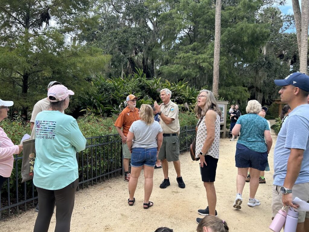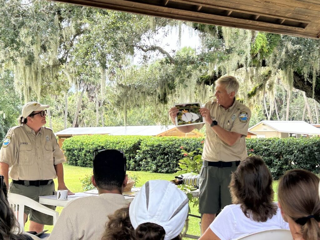 Ranger Woodbury led the discussion offering a primer on the lifecycle of butterflies before delving deeper into a discussion on the five or six main kinds of butterflies known to frequent the property. Showing examples, local butterflies ranged from the colorful Long-tailed Skipper and Gulf Fritillary to the Monarch, Cloudless Sulphur, and the Zebra Heliconian.