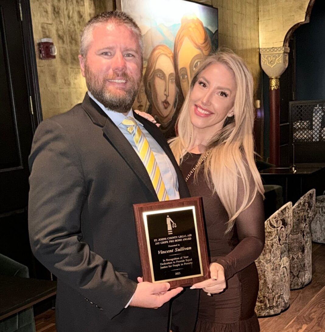 Presented annually by St. Johns County Legal Aid (SJCLA), the Jay Grife Pro Bono Award recognizes attorneys who contribute more than 100 hours of pro bono volunteer legal service each year. This distinguished honor highlights Sullivan’s continued commitment to helping bridge the justice gap for those who cannot afford legal representation.