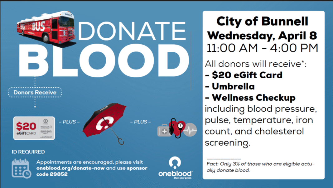 The Big Red Bus will be parked at 2301 Commerce Parkway, Bunnell, FL 32110 (First Baptist Church of Bunnell)