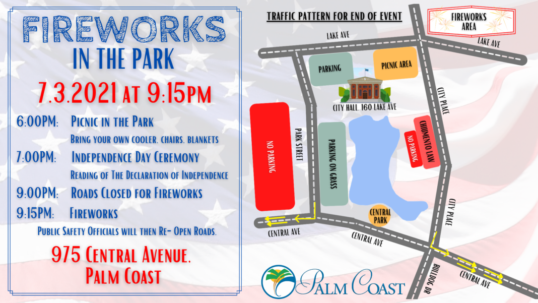 The City of Palm Coast is planning several strategies related to traffic flow, temporary road closures, and parking.  Beginning at 5 p.m., City Place north of Lake Ave and Lake Ave east of City Place will be closed off.  That area at the back side of Central Park is where the fireworks will be set off at 9:15 p.m.