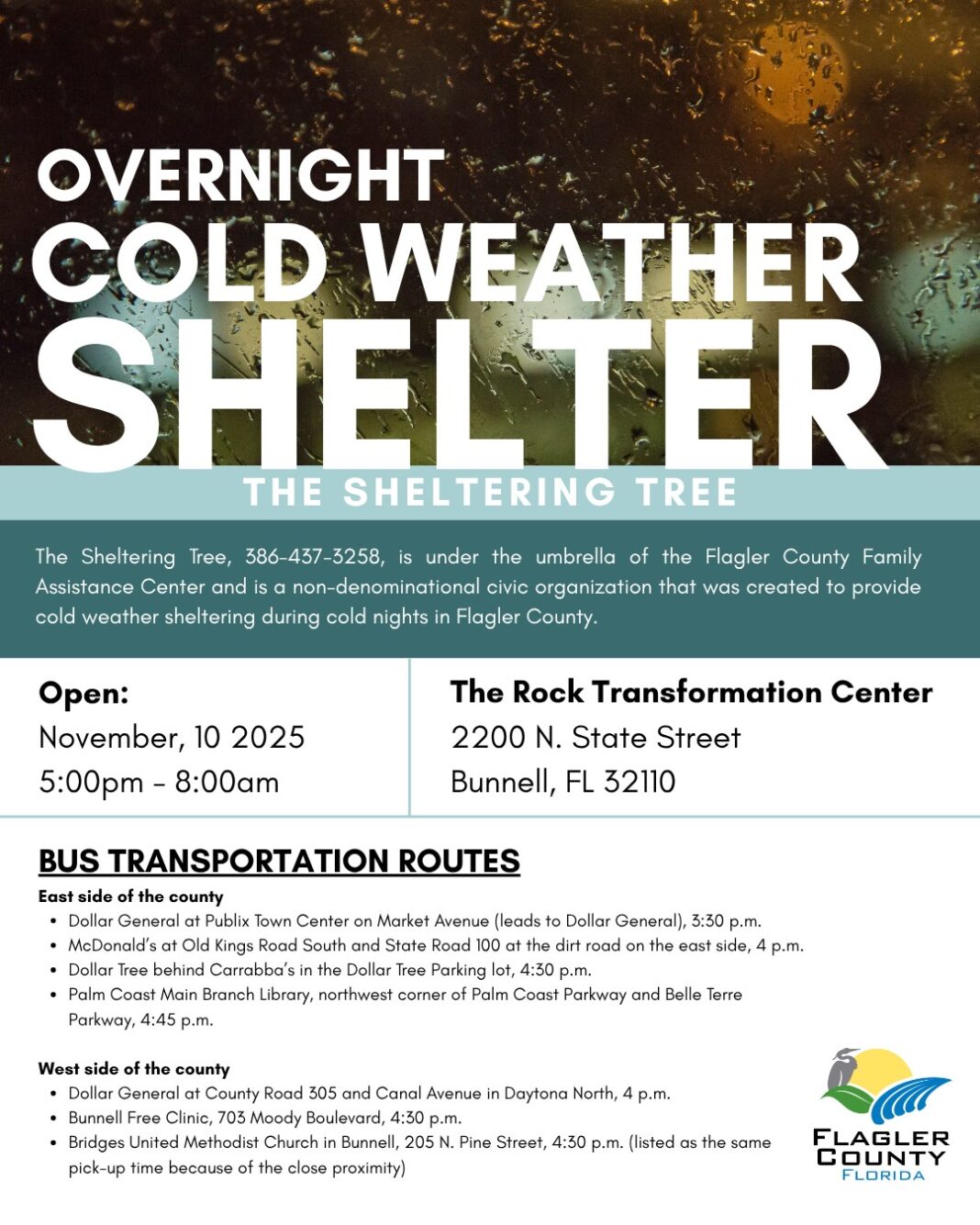 The Sheltering Tree, 386-437-3258, is under the umbrella of the Flagler County Family Assistance Center and is a non-denominational civic organization that was created to provide cold weather sheltering during cold nights in Flagler County.