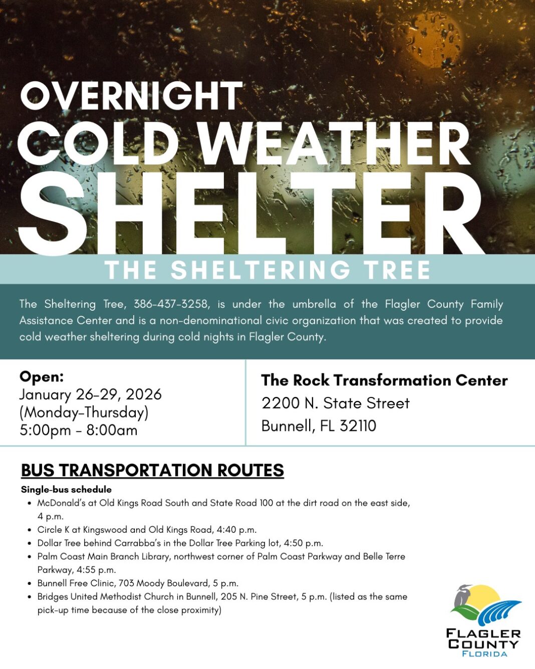The Sheltering Tree, 386-437-3258, is under the umbrella of the Flagler County Family Assistance Center and is a non-denominational civic organization that was created to provide cold weather sheltering during cold nights in Flagler County.