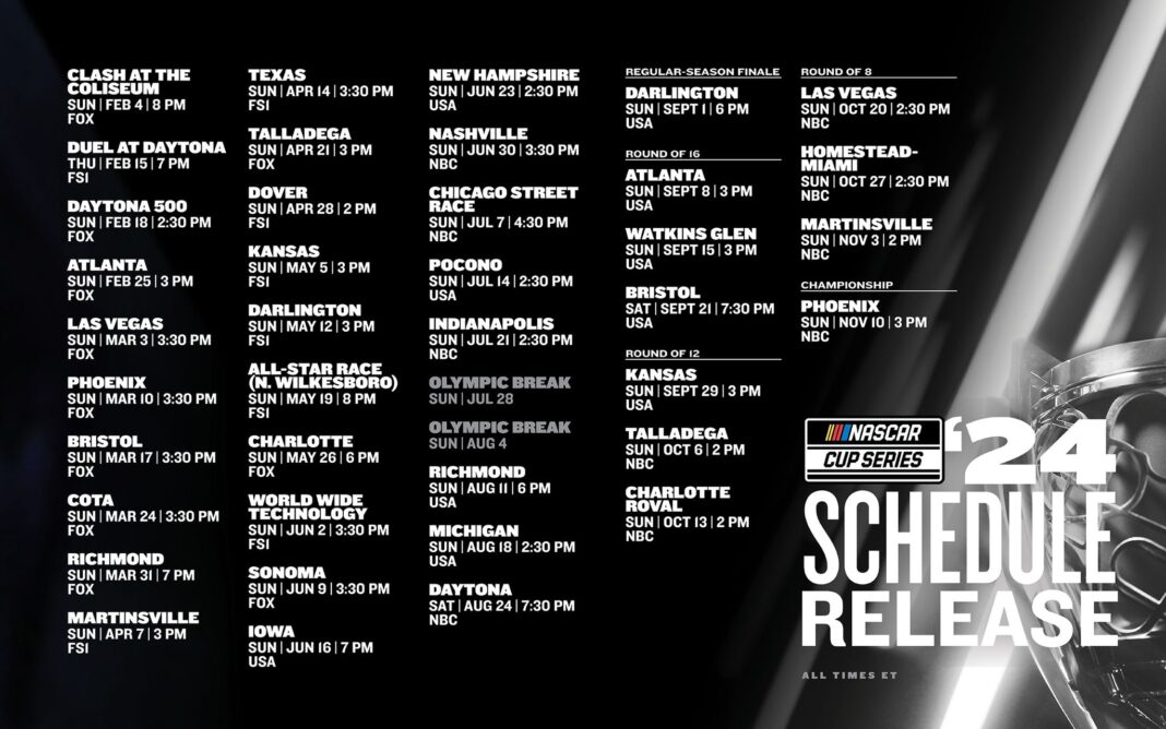 Below are the dates, times and broadcast partners for the 2024 NASCAR race weekends at Daytona International Speedway: