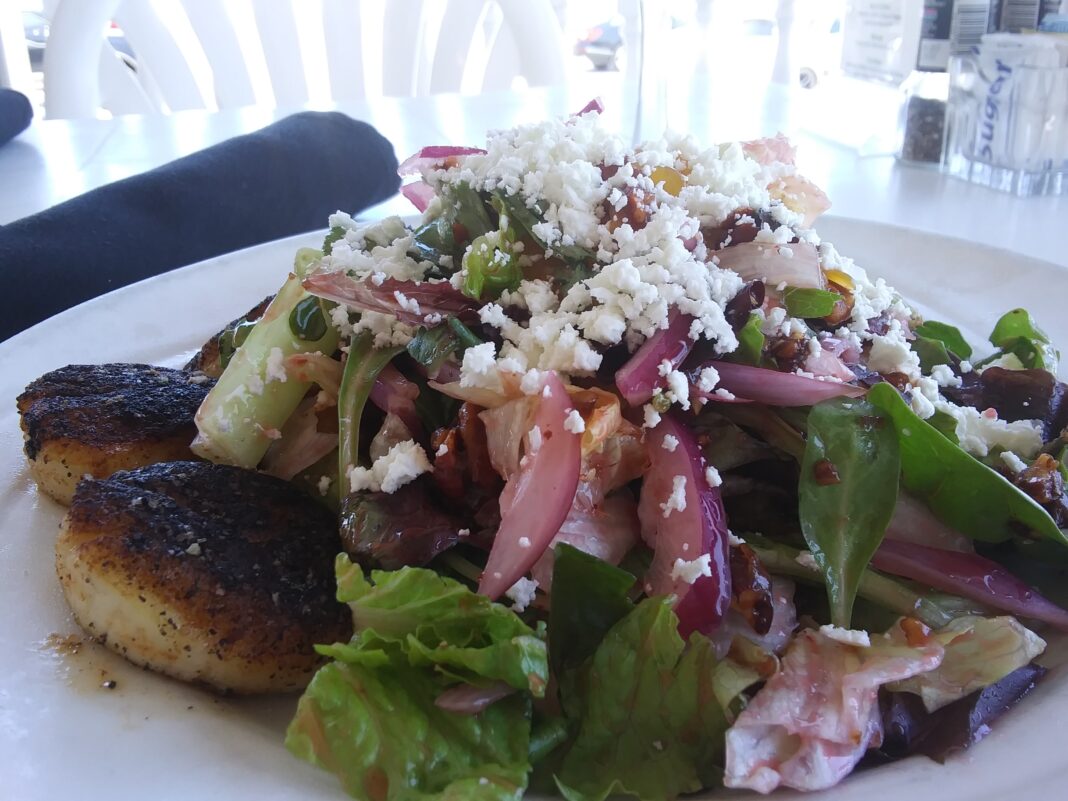 Stopping in last week, while sipping a glass of Moscato, I’d almost gone for the burger. But there was something about the Blackened Sea Scallop Salad that sounded perfect. Relaxing in the gentle fall breeze, a table arrived next to me and the fella ordered the burger, nearly making me second guess myself.