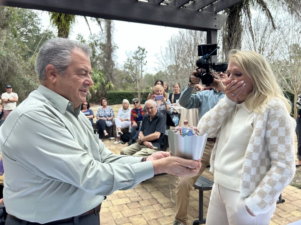 Now overseen by the Flagler County Cultural Council, the Turtle Trail has been thoughtfully cultivated for nearly a decade by arts champion and FC3 immediate past chair Nancy Crouch, whose vision and dedication helped bring the project to life. On Sunday, that legacy was celebrated in a deeply moving moment when Crouch was presented with a special token of appreciation by the Cultural Council in collaboration with artist Tom Anastasio—co-artist of the Trail’s very first loggerhead sea turtle, Claude.