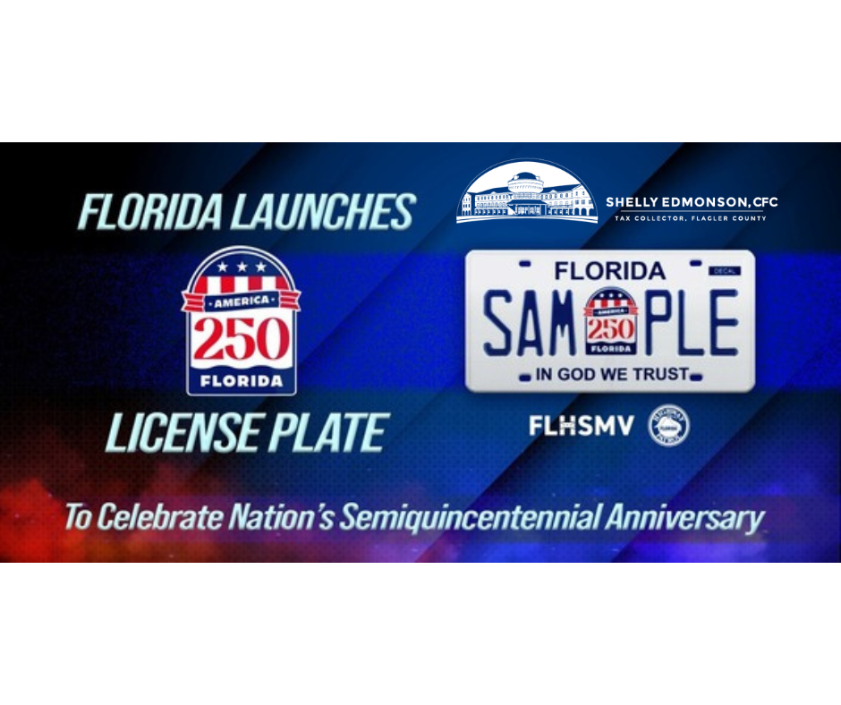 The America’s 250th Anniversary license plate is available during vehicle registration, renewal, or as a re-placement plate at all Flagler County Tax Collector offices. Regular registration and license plate fees apply. Additional fees may apply for replacement plates.