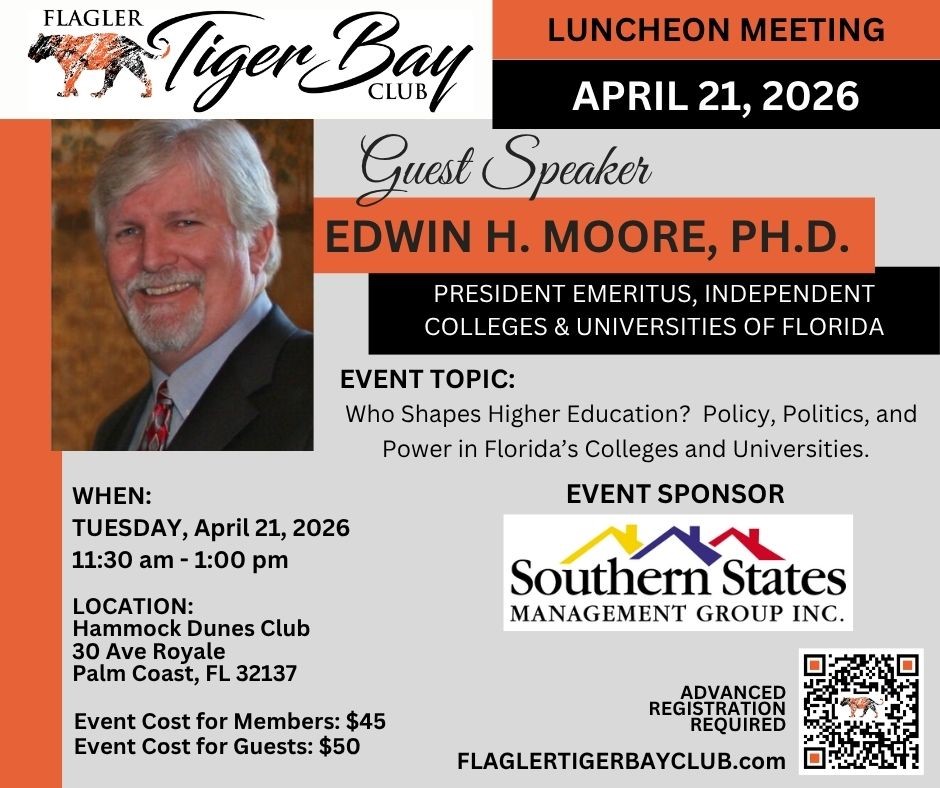 Palm Coast, Fla. (March 30, 2026) – The Flagler Tiger Bay Club is proud to announce its 2026 Spring Speaker Series, featuring a dynamic lineup of thought leaders in higher education, investigative journalism, and public policy. The spring series will take place at the Hammock Dunes Club and is expected to draw strong interest from across the community. Early registration is strongly encouraged, as each event is anticipated to sell out.