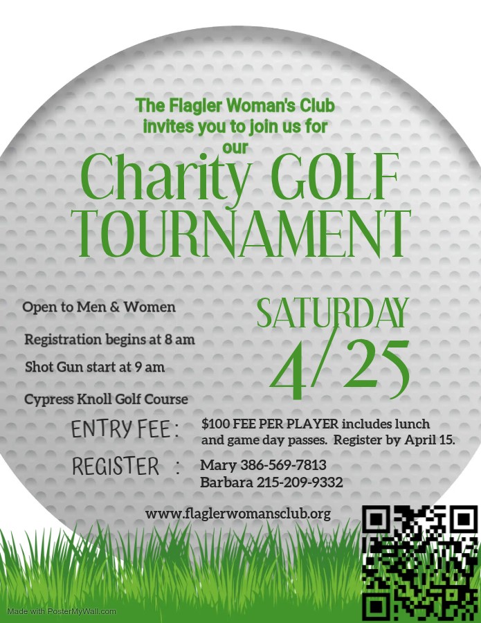 The Flagler Woman’s Club invites you to join us for our Charity Golf Tournament on Saturday, April 25, at Cypress Knoll Golf Course in Palm Coast.  Open to men and women.  Registration begins at 8am, Shot Gun Start 9am Four-person scramble. $100 per Golfer includes greens fees, cart, contest passes valued at $20, range balls, and lunch with unlimited soda and beer.  Raffles, Prizes and more!  Net proceeds benefit local charities. Golfers must pre-register so call Mary 386-569-7813 or Barbara at 215-209-9332 for more details.