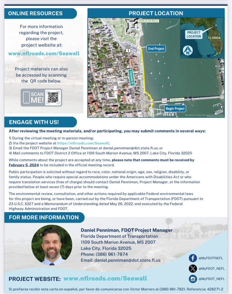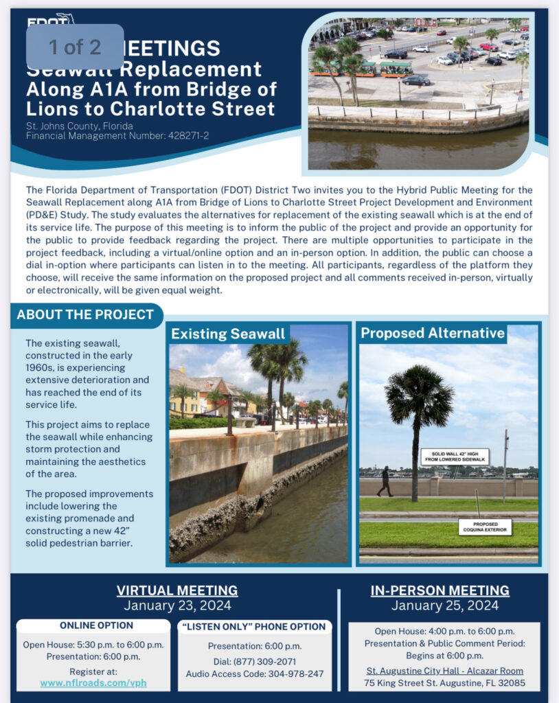 The Florida Department of Transportation (FDOT) District Two will host two meetings, one online/virtual on Tuesday, January 23 and one in-person on Thursday, January 25, to inform the public and gather input for a seawall replacement project along A1A from Bridge of Lions to Charlotte Street. The Project Development and Environment (PD&E) Study evaluates the alternatives for replacement of the existing seawall which is at the end of its service life.