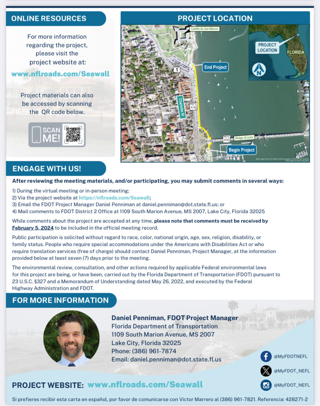 While comments about the project are accepted at any time, please note that comments must be received by February 5, 2024, to be included in the formal meeting record. Public participation is solicited without regard to race, color, national origin, age, sex, religion, disability, or family status. People who require special accommodations under the Americans with Disabilities Act or who require translation services (free of charge) should contact Daniel Penniman, Project Manager, at the information provided below at least seven (7) days prior to the meeting. The environmental review, consultation, and other actions required by applicable Federal environmental laws for this project are being, or have been, carried out by the Florida Department of Transportation (FDOT) pursuant to 23 U.S.C. §327 and a Memorandum of Understanding dated May 26, 2022, and executed by the Federal Highway Administration and FDOT.