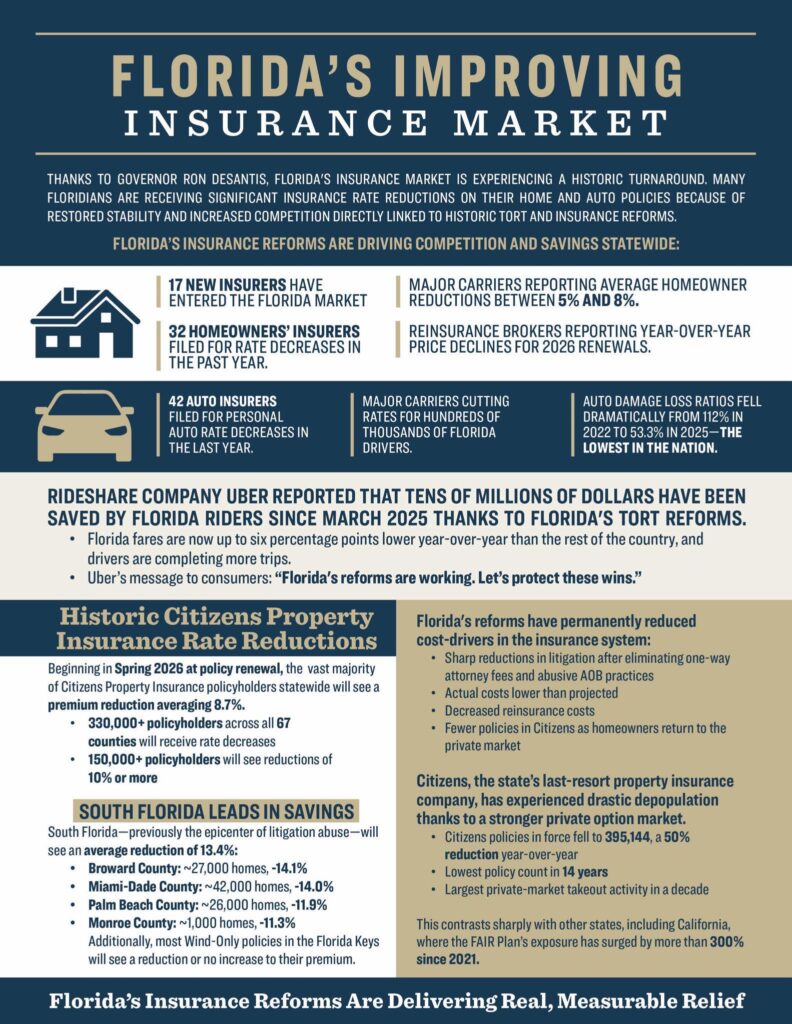 DAVIE, Fla.—Today, Governor Ron DeSantis announced significant statewide insurance rate relief for Florida homeowners, as Citizens Property Insurance policyholders across the state will see meaningful premium reductions beginning in Spring 2026 at policy renewal. The reductions reflect continued stabilization of Florida’s insurance market following comprehensive insurance and tort reforms enacted under Governor DeSantis’ leadership.