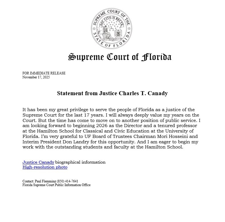 “It has been my great privilege to serve the people of Florida as a justice of the Supreme Court for the last 17 years. I will always deeply value my years on the Court. But the time has come to move on to another position of public service. I am looking forward to beginning 2026 as the Director and a tenured professor at the Hamilton School for Classical and Civic Education at the University of Florida. I’m very grateful to UF Board of Trustees Chairman Mori Hosseini and Interim President Don Landry for this opportunity. And I am eager to begin my work with the outstanding students and faculty at the Hamilton School.” — Justice Charles T. Canady