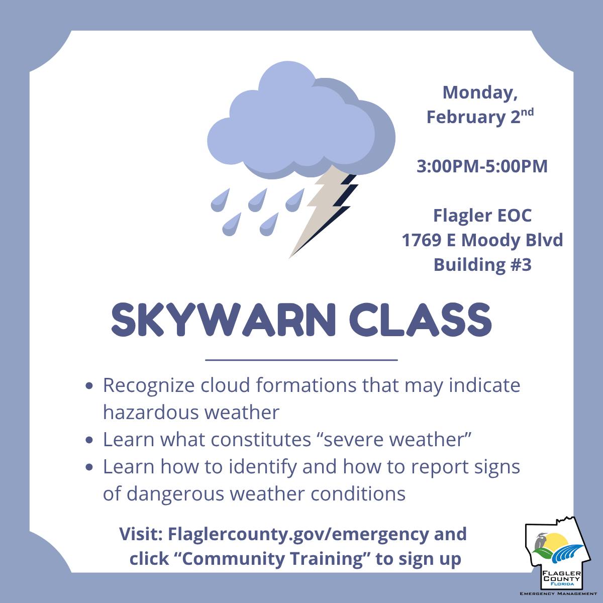 January 5, 2026 – Flagler County Emergency Management will host the National Weather Service’s free Skywarn Storm Spotter class at 3 p.m. on Monday, February 2, at the county’s Emergency Operations Center.