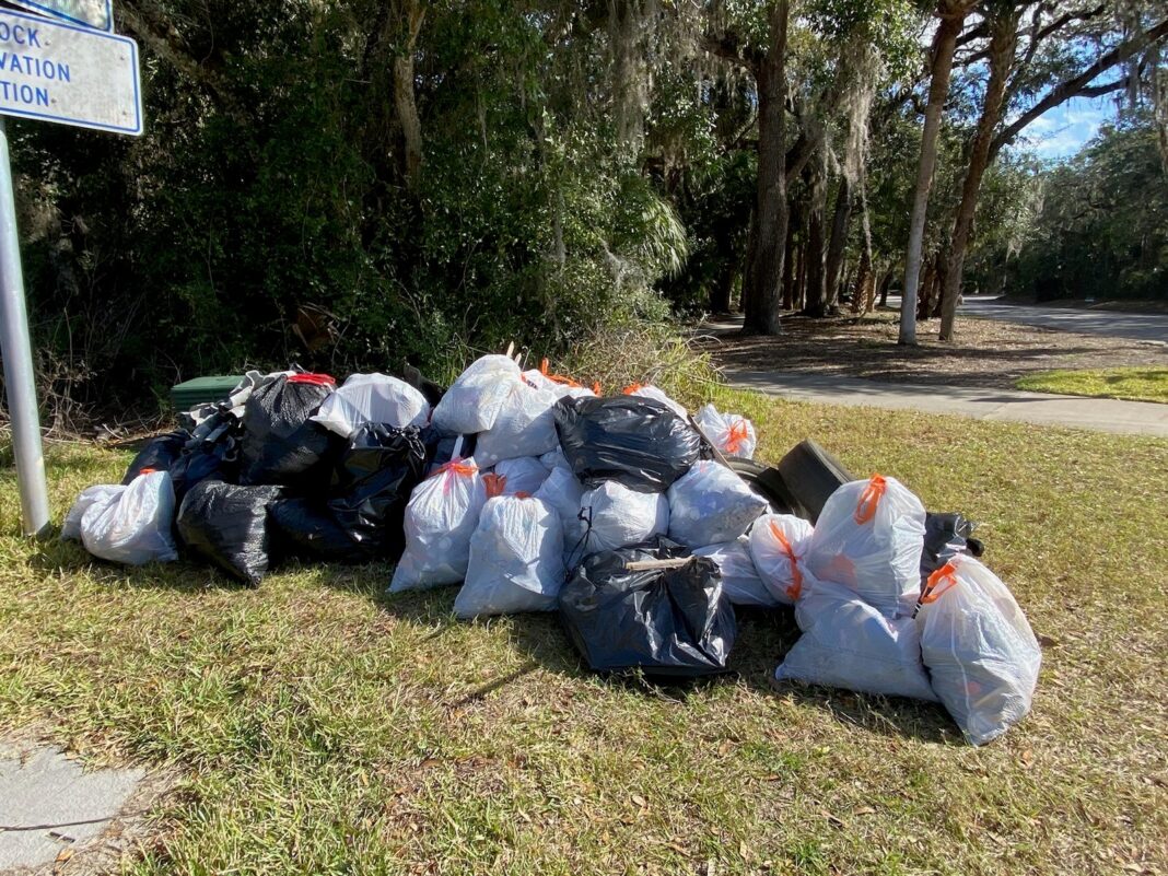 February 23, 2023 – While many spent their Saturday (February 18) at the Speedway in Daytona Beach, 32 members and friends of the Hammock Community Association spent the day collecting garbage along about 5 miles of State Road A1A and portions of the MalaCompra Road and the bike trail. By day’s end, the volunteers had collected 74 bags of trash.