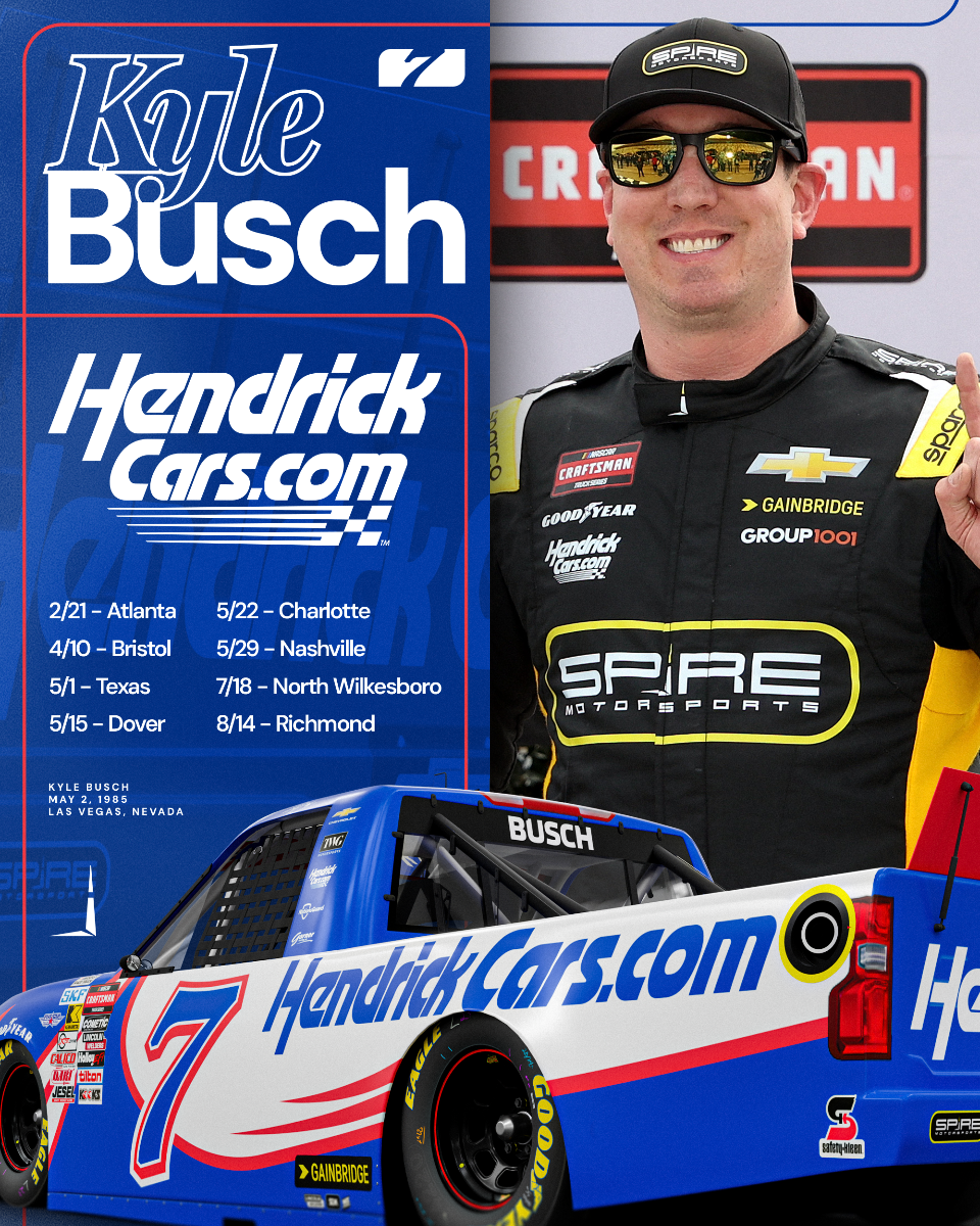 MOORESVILLE, N.C. (February 9, 2026) – Kyle Busch, one of NASCAR’s most accomplished drivers of the modern era, will compete in eight NASCAR CRAFTSMAN Truck Series races for Spire Motorsports in 2026. HendrickCars.com will serve as the primary partner aboard the team’s No. 7 Chevrolet Silverado for the bulk of Busch’s eight-race slate.