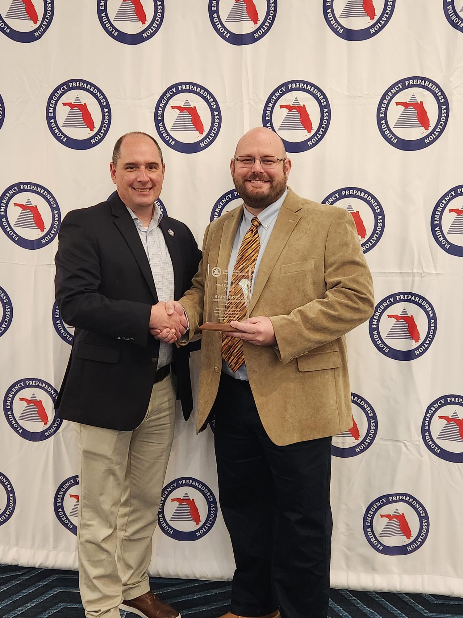 February 2, 2024 – Flagler County Emergency Management Manager Ryan Simpson was presented with the Florida Emergency Preparedness Association (FEPA) “Gary Arnold Emergency Management Service Award” at its annual meeting Thursday (February 1). This award is provided to an individual for dedicated, unselfish and enthusiastic service to improving the emergency management community in Florida.