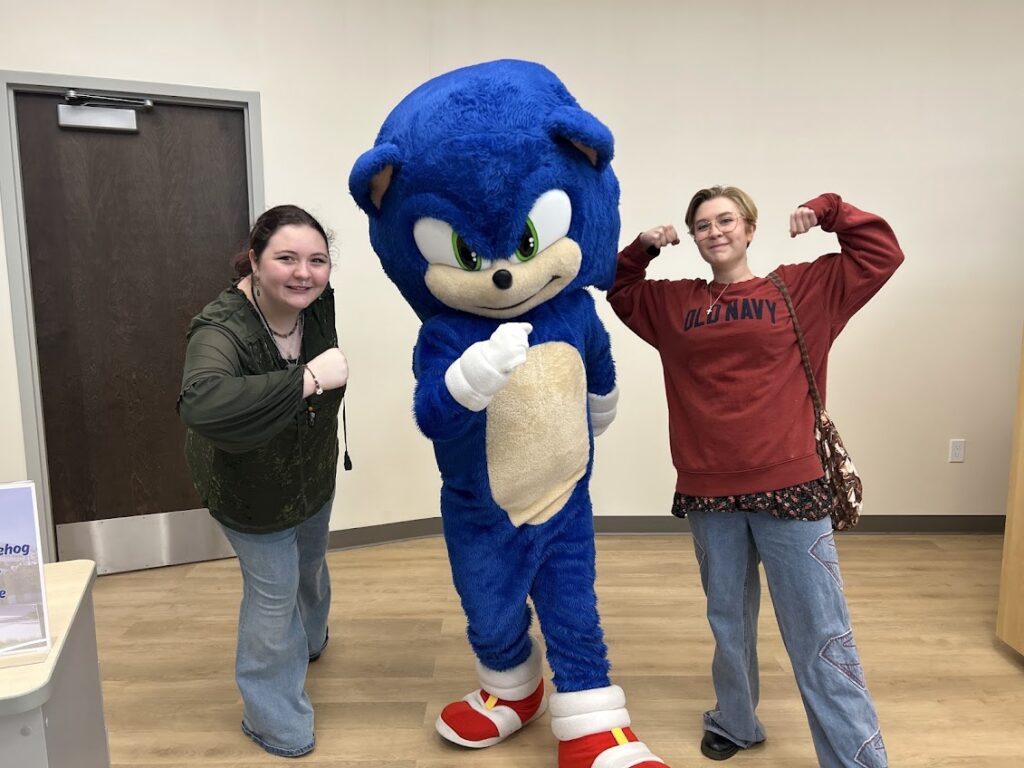 Among the newbies to the library, teens Flee Fleenor and MJ Moros came to snap a photo with Sonic the Hedgehog. Welcoming youth of all ages to the teen area of the new library, the popular mascot was part of the youth activities planned during the grand opening celebration.
