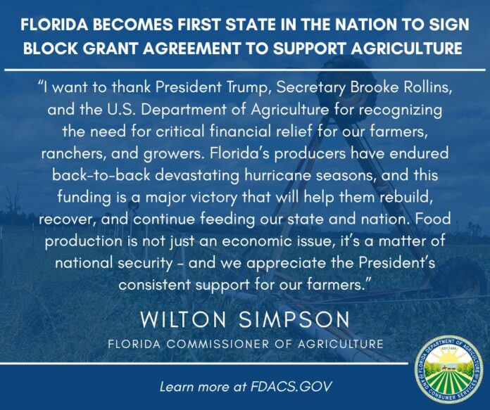 WASHINGTON, July 21, 2025 – U.S. Secretary of Agriculture Brooke L. Rollins today in Florida met with agricultural leaders and producers and announced additional U.S. Department of Agriculture (USDA) assistance to help producers recover from Hurricanes Idalia, Debby, Helene and Milton. Secretary Rollins signed a block grant agreement with the Florida Department of Agriculture and Consumer Services (FDACS) that provides recovery assistance for Floridian farmers.
