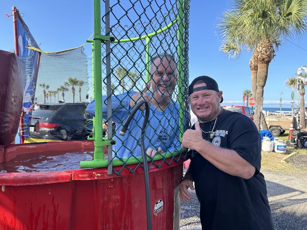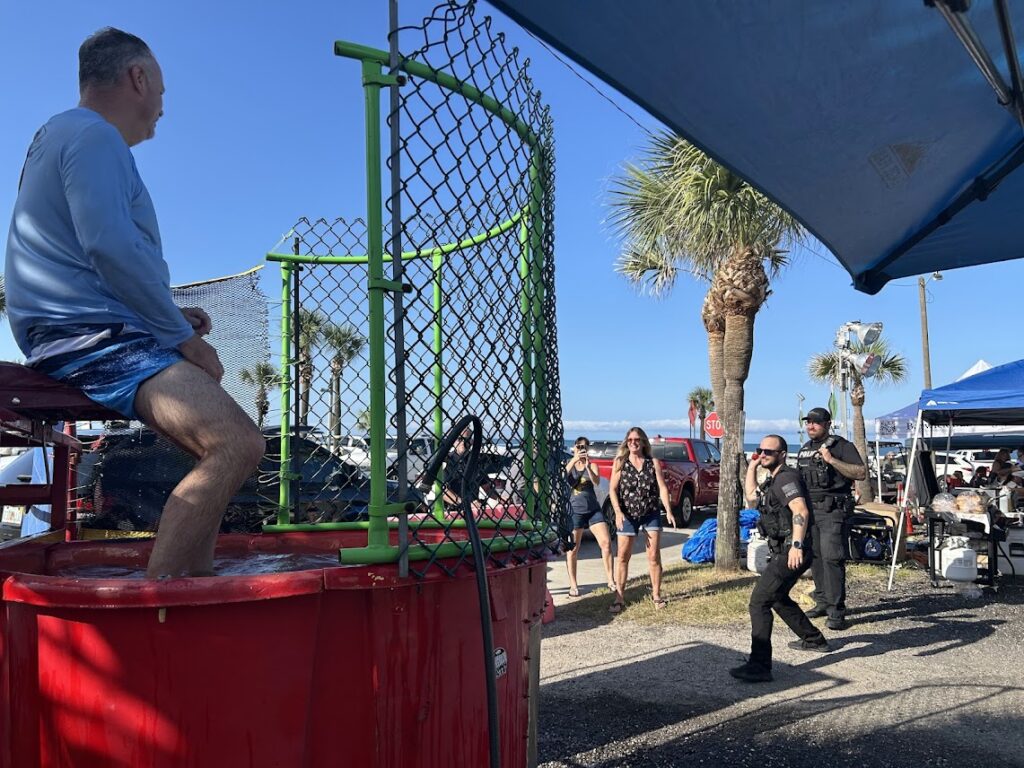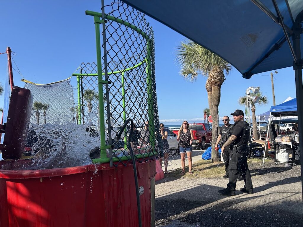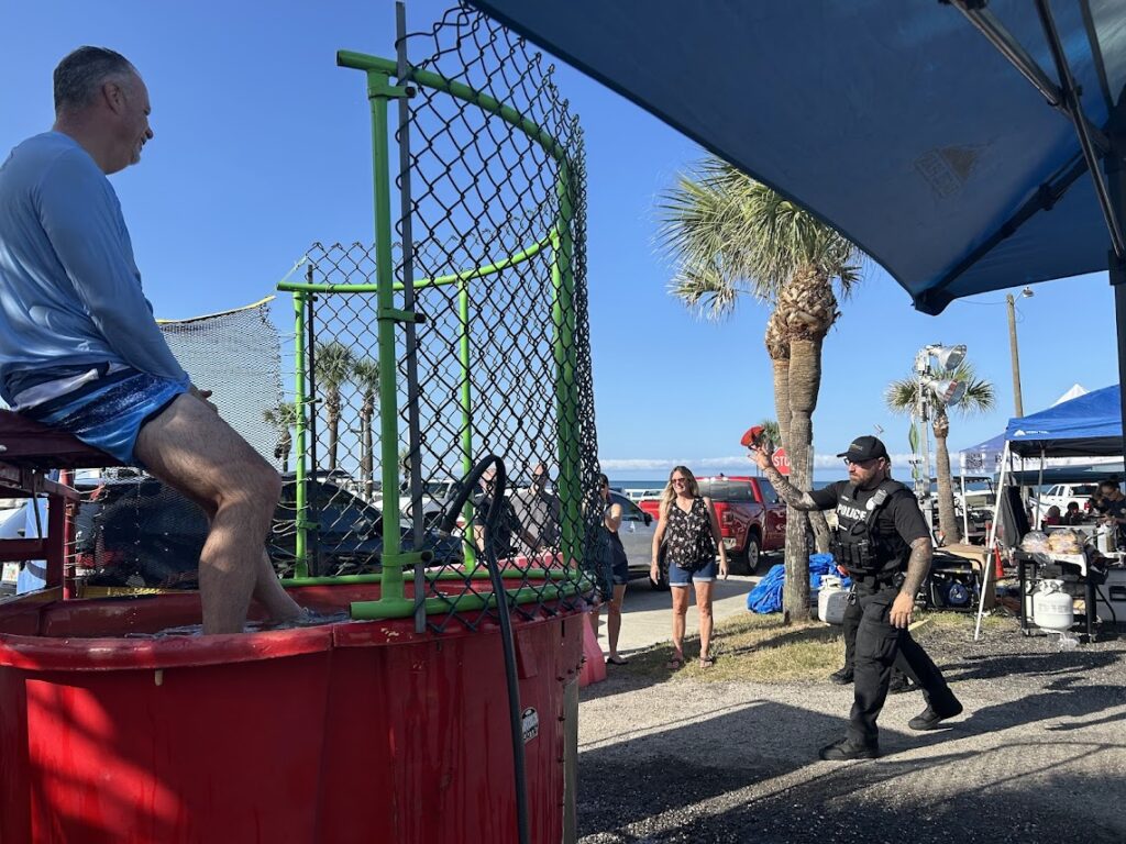 Scott Fox, co-owner of the host location Tortugas Florida Kitchen & Bar, bravely stepped up to the plate for the dunk tank to help raise funds and opened his wallet when it was Flagler Beach Police Chief Matt Doughney’s turn to get wet. Others paid to let the officers on the beach town’s small department have a turn at dunking the chief, all in good fun, of course.