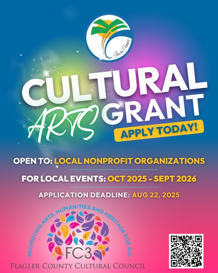 Palm Coast –The City of Palm Coast, in partnership with the Flagler County Cultural Council (FC3), is pleased to announce that applications are now open for the 2025-2026 cycle of the Palm Coast Cultural Arts Grant Program. As part of an official agreement, FC3 now manages this program on behalf of the City, representing a shared commitment to fostering arts, culture, and history across our community.