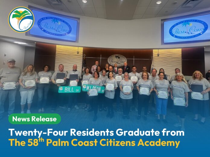 Palm Coast – Twenty-four residents of Palm Coast celebrated their graduation from the 58th session of the Palm Coast Citizens Academy during the City Council meeting on Tuesday, November 4, 2025.