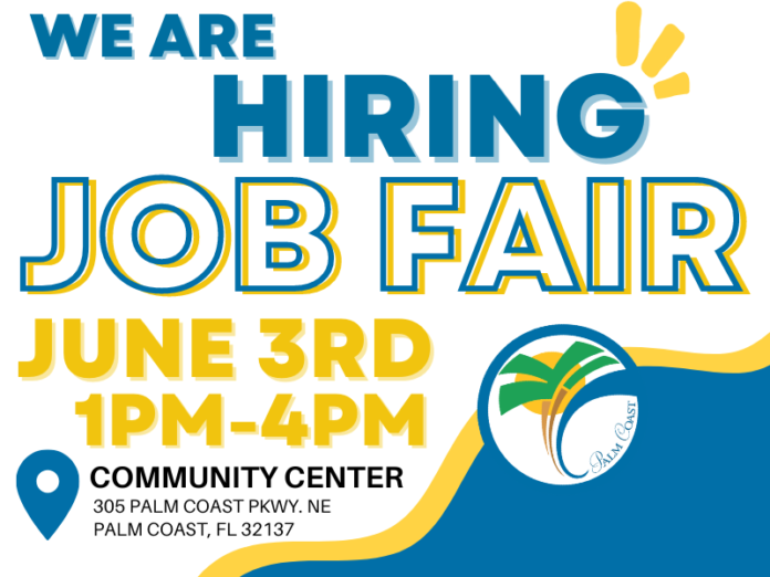 The Human Resources department will be hosting a Job Fair on June 3, 2022 from 1 p.m. to 4 p.m. at the Palm Coast Community Center located at 305 Palm Coast Pkwy.