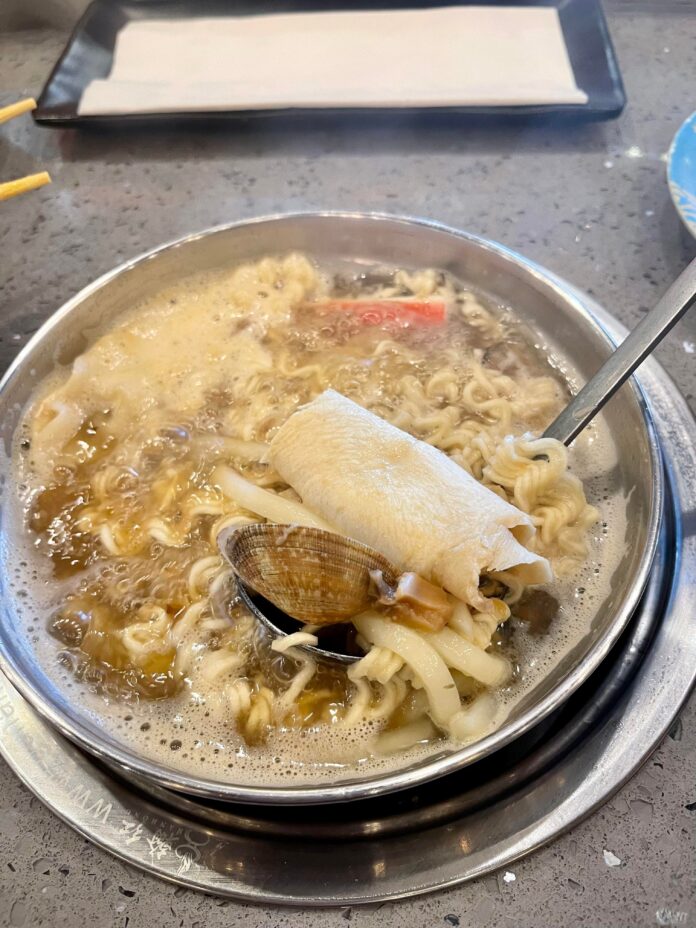 As we entered the Top Top Hot Pot Restaurant, the first thing I noticed was the big revolving buffet of small plates circling the center of the room. The hostess sat us at this moving food station that included a sunken burner at each seat. She explained that we would need to pick out a soup base and meat choice, which she would bring to us. I picked the mushroom base, while Abbie decided on the Tom Yum. We both chose chicken as our meat. A few minutes later the waitress returned with big metal pots full of broth that she placed inside our burners and a plate of thin-sliced, rolled-up chicken pieces. The rest of the recipe was completely our decision, as we could grab any other ingredients to cook in our pot as they passed by on the rotating all-you-can-eat buffet. There were noodles of every size and texture, vegetables, different varieties of meatballs and meat-filled dumplings as well as every seafood option that you could imagine. I chose the pork dumplings, Udon and ramen noodles, clams, crab and tofu. I was not brave enough to try the quail eggs or fish balls, maybe next time….or not!