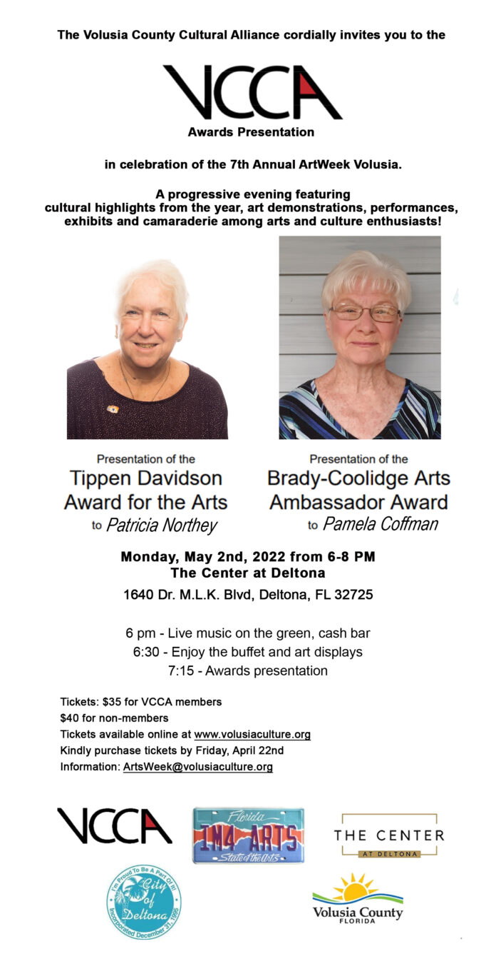 The Volusia County Cultural Alliance (VCCA) will honor Pat Northey for her service to Arts and Culture at its Annual Celebration and Awards Ceremony on May 2, 2022 from 6 pm to 8 pm at The Center in Deltona. Northey, a former County Commissioner and long-time advocate for arts projects, will be the 15th recipient of the prestigious Tippen Davidson Award for the Arts. This award, named for the former News-Journal Publisher and arts advocate, was established to recognize leadership and long-standing support for cultural endeavors in Volusia County. Past honorees have included Cici and Hyatt Brown, Rene & Larry Sands, Nancy and Lowell Lohman, and Sally Mackay, along with many others. Ms. Northey will receive a commissioned art glass piece by local artist L.C. Tobey at the ceremony. She will be honored again in the Fall when her name will be added to the honoree wall outside Council Chambers at the Thomas C. Kelly Administration Center in DeLand.