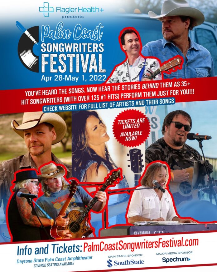 Palm Coast, FL – The Palm Coast Songwriters Festival returns in 2022 with nearly 40 HIT songwriters performing over 125 #1 HITS during the three-day ticketed festival, April 28 thru May 1 at Daytona State College Palm Coast Amphitheater. Single and three-day passes, with a limited number of reserved covered seating, are still available for purchase at www.palmcoastsongwritersfestival.com/purchasetickets.