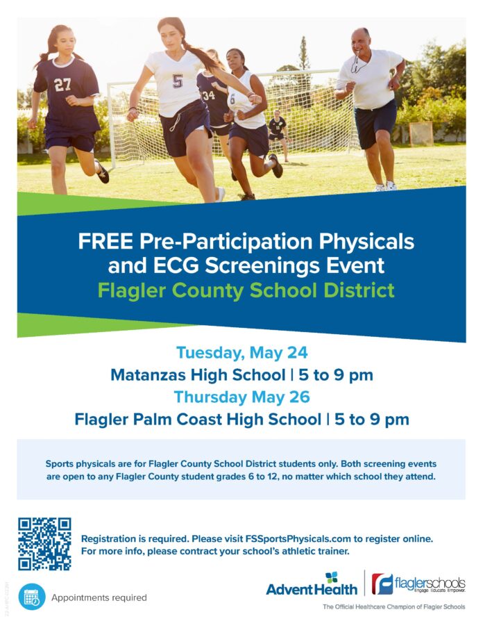 AdventHealth will offer free sports pre-participation physicals and ECG screenings to Flagler School students on May 24th and 26th.