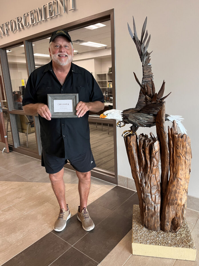Wallace states, “My art work is something that gives me a place to go and focus on nothing else, but what I am working on at the time. I was a scuba diver for 35 years, diving old wrecks up and down the east coast and around the world. Those years left a big impression on the sights and critters I have seen, and try to create my vision of them. My eagle was the first piece to even impress me on how he turned out. I think that is why I wanted to share it with lots of people and hope most would feel the same. What better place than City Hall!”