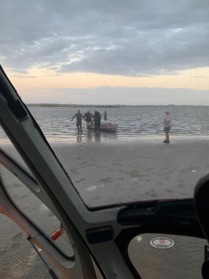 FireFlight was dispatched at about 5:30 p.m. Monday to help locate the boaters in distress, stuck in what was later confirmed to be 4 inches of water. Pilot Todd Whaley and Flight Medic Frank Mesta located the vessel, made contact with the Florida Fish and Wildlife Conservation Commission officer sent to assist in the Intracoastal Waterway, and guided an employee from the boat rental company (also struggling in the shallow water) to the location of the distressed boaters.