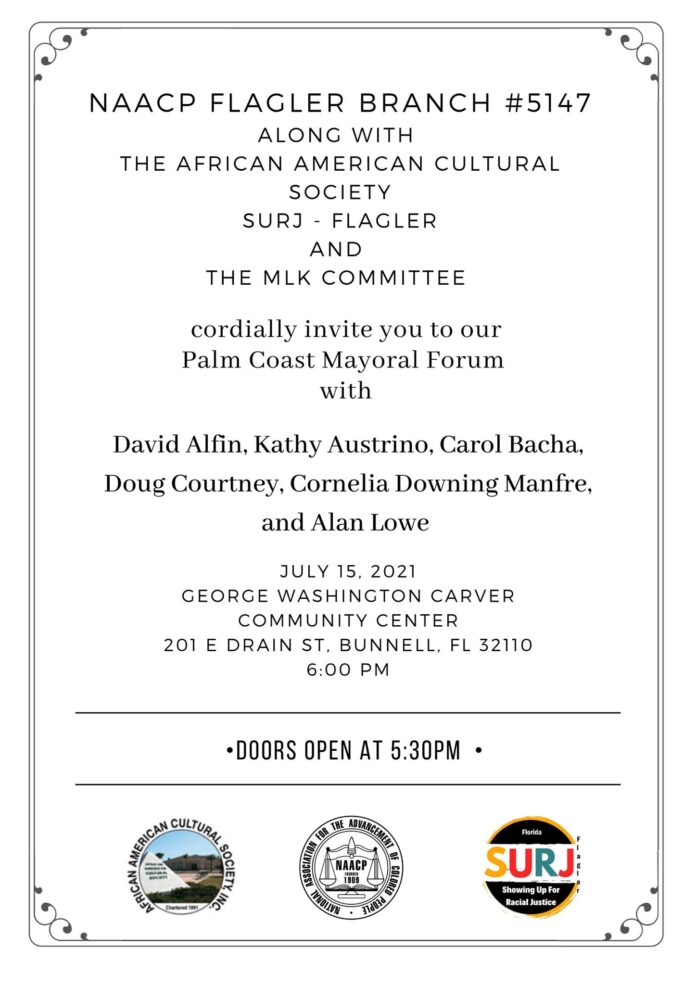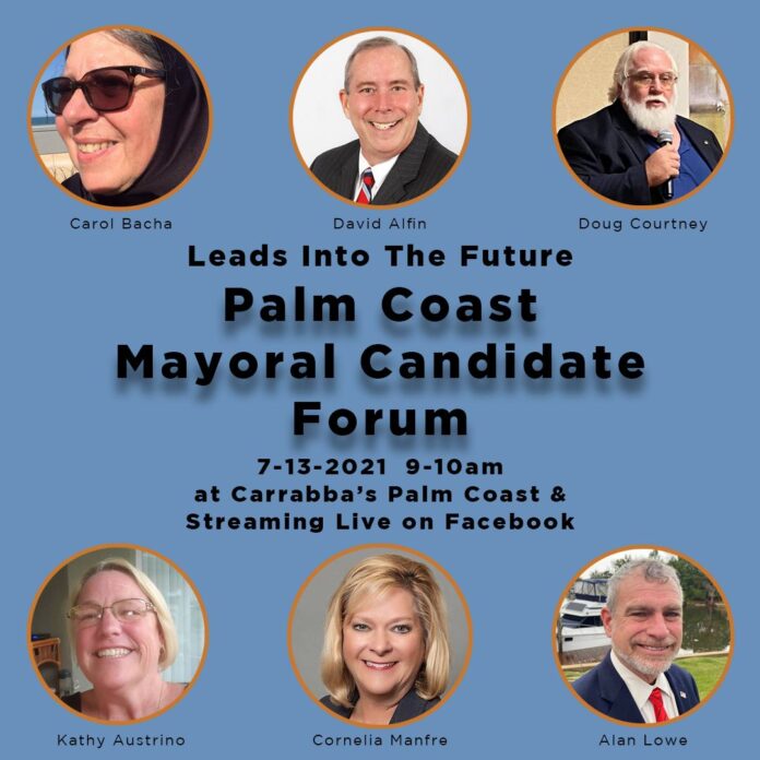 Leads into the Future presents a special Palm Coast Mayoral Candidate Forum on Tuesday, 7/13 from 9-10am at Carrabba’s Italian Grill and streaming live on https://www.facebook.com/groups/leadsintothefuture.
