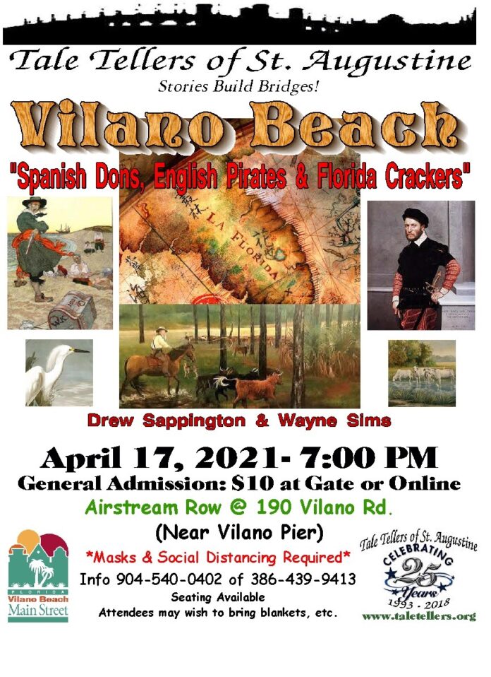 Two well seasoned and nationally acclaimed storytellers, Drew Sappington and Wayne Sims, perform humorous but true stories from St. Augustine’s history. Fascinating tales include: Indians attacks on pirates to rescue cowboys; potty-mouthed governor bluffing buccaneers; fake ear starts a war; pirate helps build fort after his execution; Ralph Waldo Emerson and the banking Methodists; and single boat attack pirate fleet.
