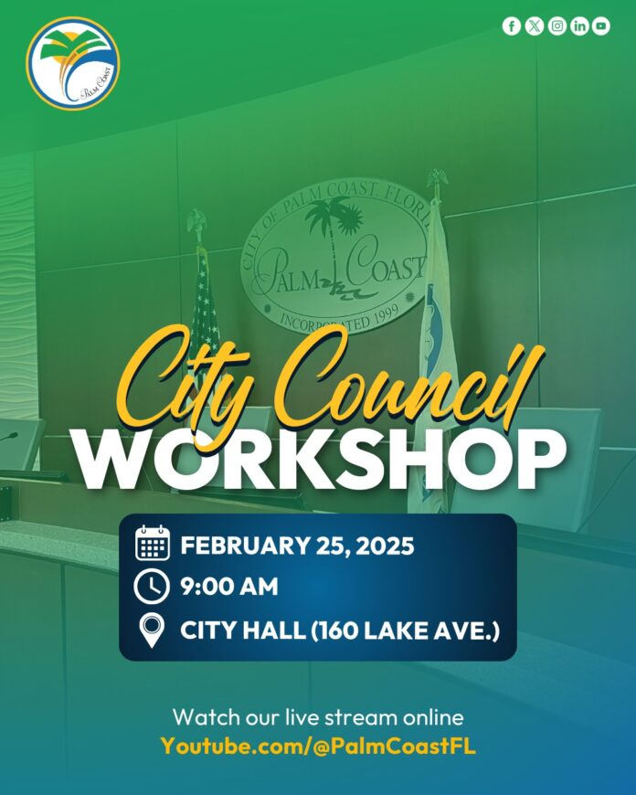 Beginning February 4, 2025, the Council will hold the following meetings each month: a business meeting at 6 p.m. on the first Tuesday, a workshop at 6 p.m. on the second Tuesday, a business meeting at 9 a.m. on the third Tuesday, and a new workshop at 9 a.m. on the fourth Tuesday. All meetings will continue to be held in the Community Wing at City Hall, 160 Lake Avenue, Palm Coast.
