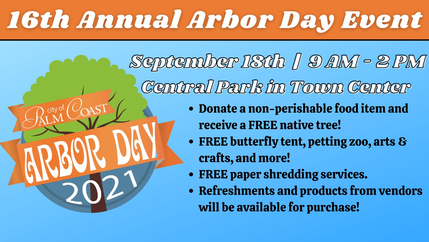 The City of Palm Coast will be holding its 16th Annual Arbor Day event on September 18th from 9 a.m. – 2 p.m. at Central Park in Town Center, 975 Central Ave. Admission is free! Refreshments and products from vendors will be available for purchase.