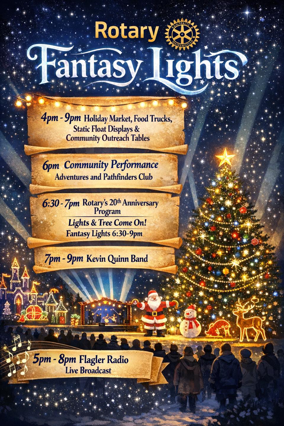 Palm Coast – The City of Palm Coast invites residents and visitors to Central Park in Town Center on Saturday, December 20, for a special 20th Anniversary Celebration of the Fantasy Lights Festival, presented by the Rotary Club of Flagler County.