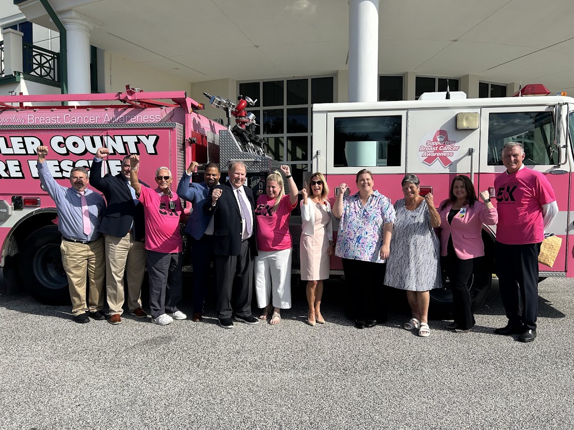 Kicking off a month and half of fundraising events hosted by a number of community organizations and businesses to help qualified patients receive breast cancer diagnostic screening and support through the AdventHealth Palm Coast Foundation, the fanfare started on Monday, September 15 with a proclamation from the Flagler County Board of County Commissioners, and a commemorative photo with the county’s pink firetruck in front of the Flagler County Government Services Building.