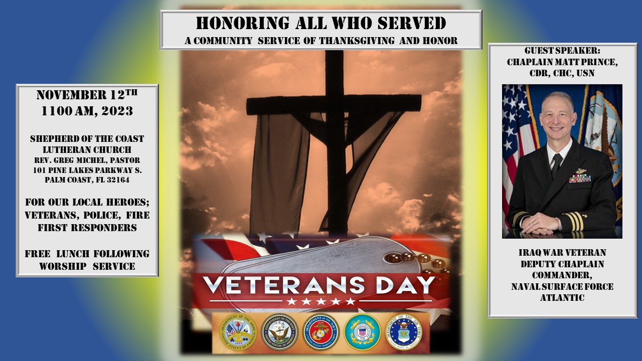 Chaplain Matt Prince, Commander, US Navy, Iraq war veteran, will be the guest speaker for a community Veteran Day’s service, Sunday, November 12th, 11:00 AM, at Shepherd of the Coast Lutheran Church. The Palm Coast community is invited to join us in a service of thanksgiving and honor for all who have served.